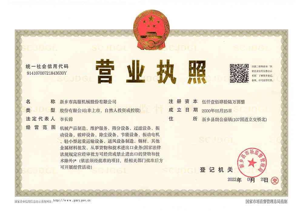 新乡市高服机械股份有限公司前身前身始创于八十年代,经过40多年的发展已成为“国*级专精特新小巨人企业”、“国*级绿色工厂”、“国*级高新技术企业”、“国*级知识产权优势企业”,以及“振动协会会长单位”。同时挂牌“河南省工业设计中心”、“河南省智能在线筛分系统工程技术研究中心”、“新乡市精细筛分工程技术研究中心”;并成功申请发明、实用新型及外观等专*500多项,拥有“国*工*部颁发的科技成果奖”,参与起草制定了4项“国*标准”。